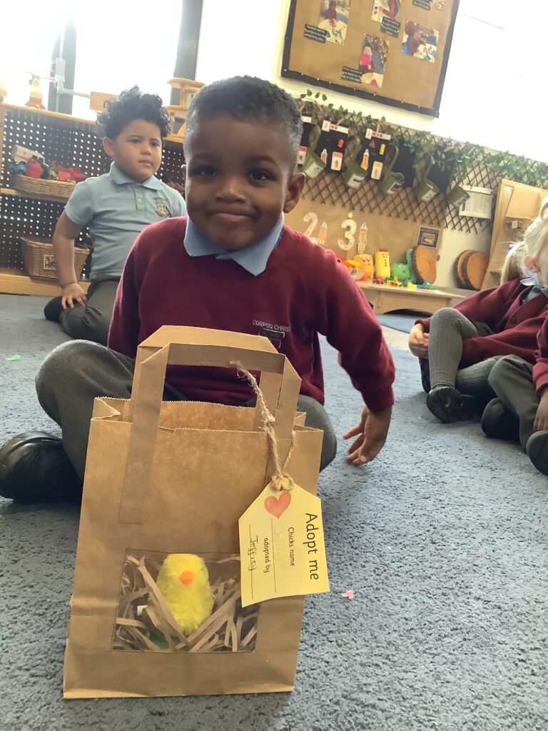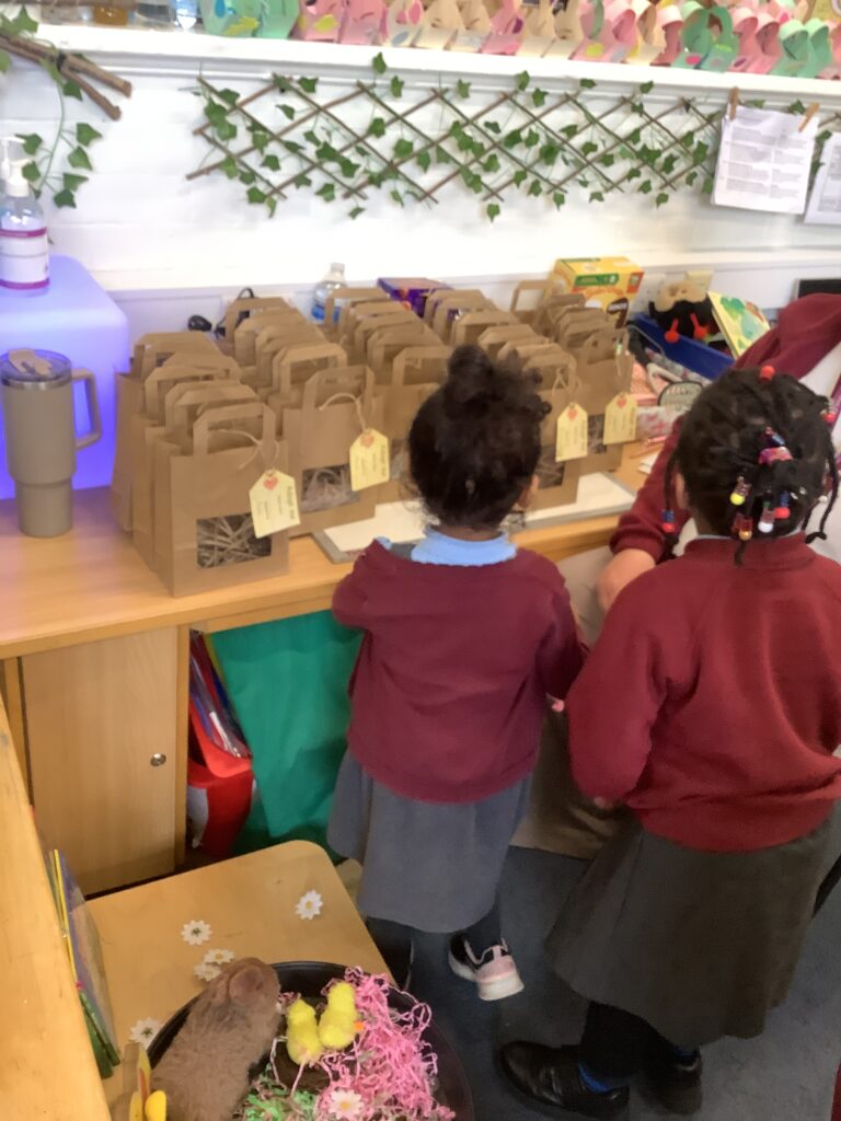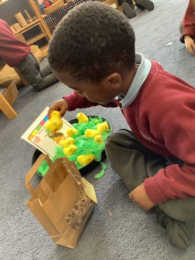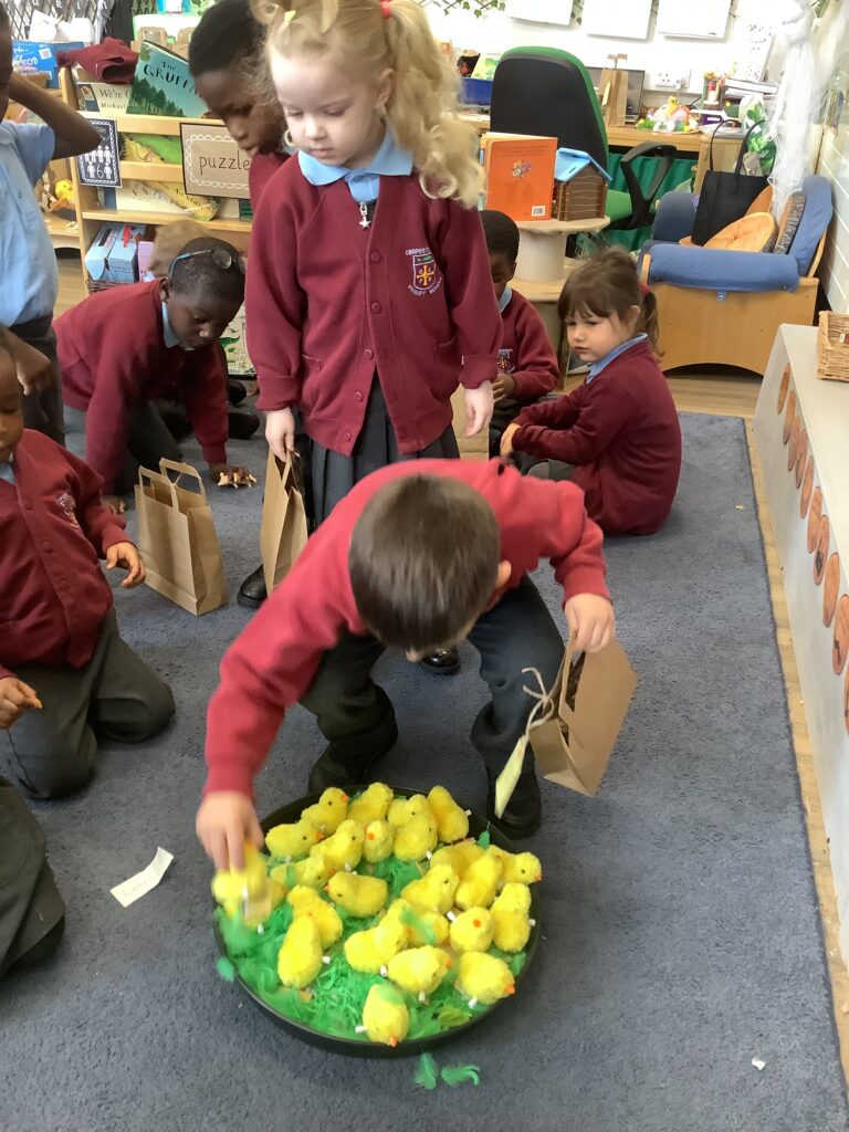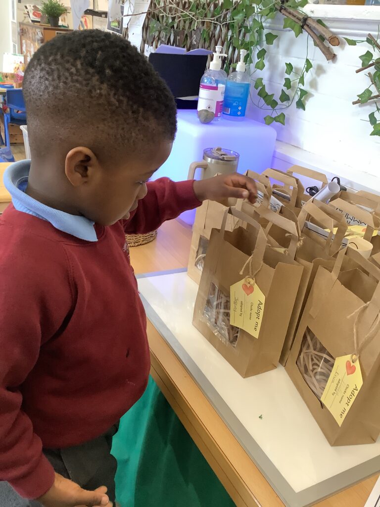 First, the children found their own bag to keep their chick safe by recognising their name own on the gift tag.