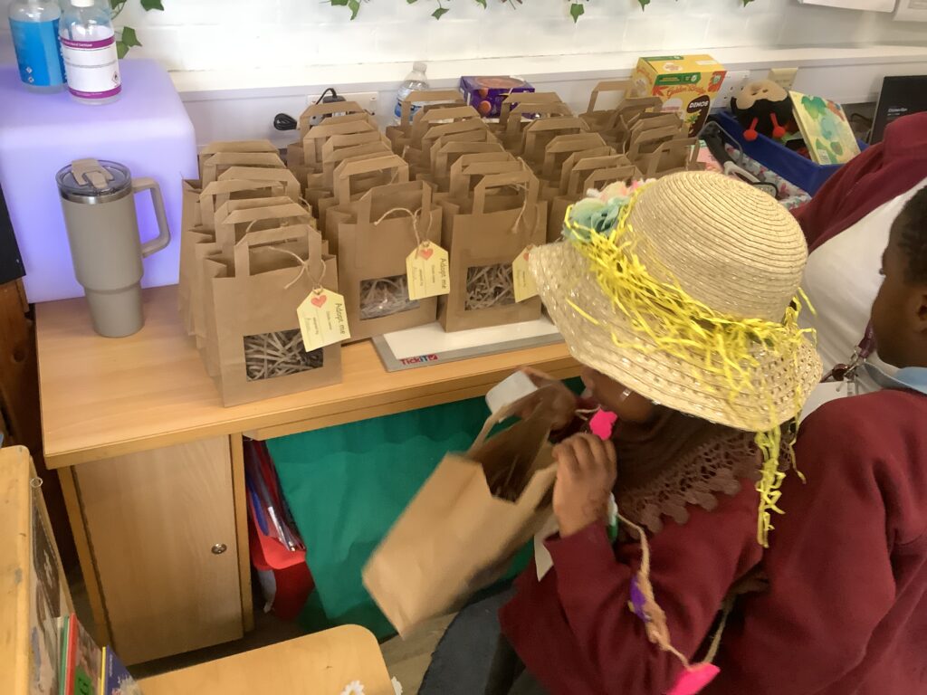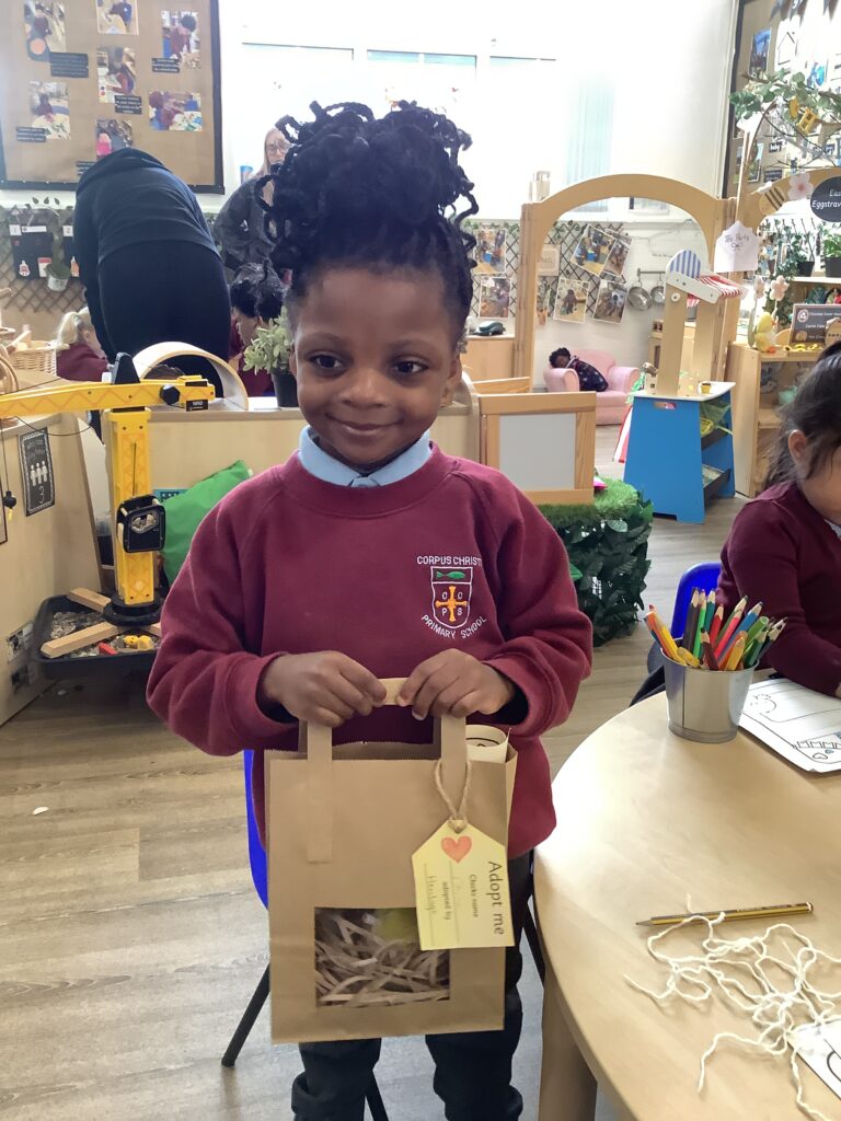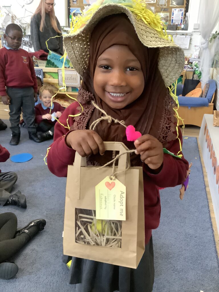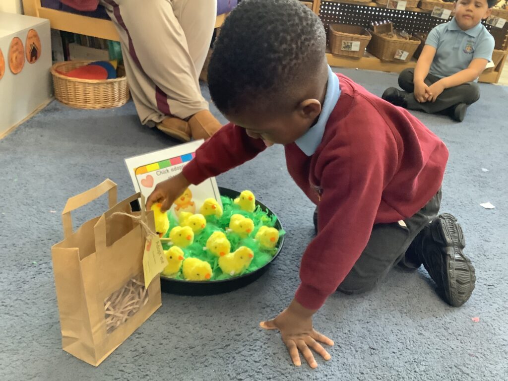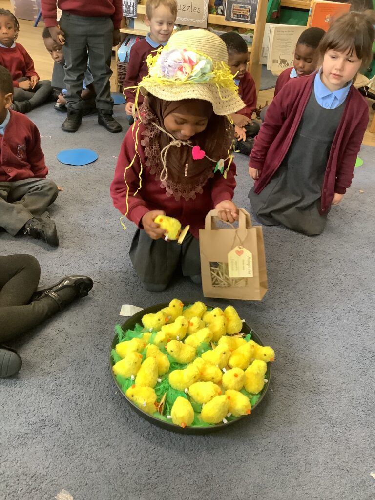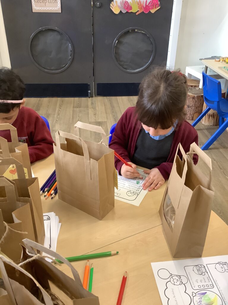 First, the children found their own bag to keep their chick safe by recognising their name own on the gift tag.