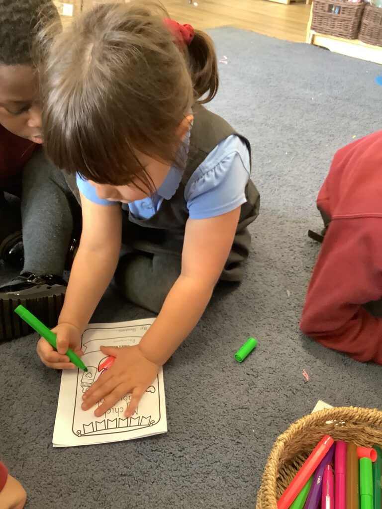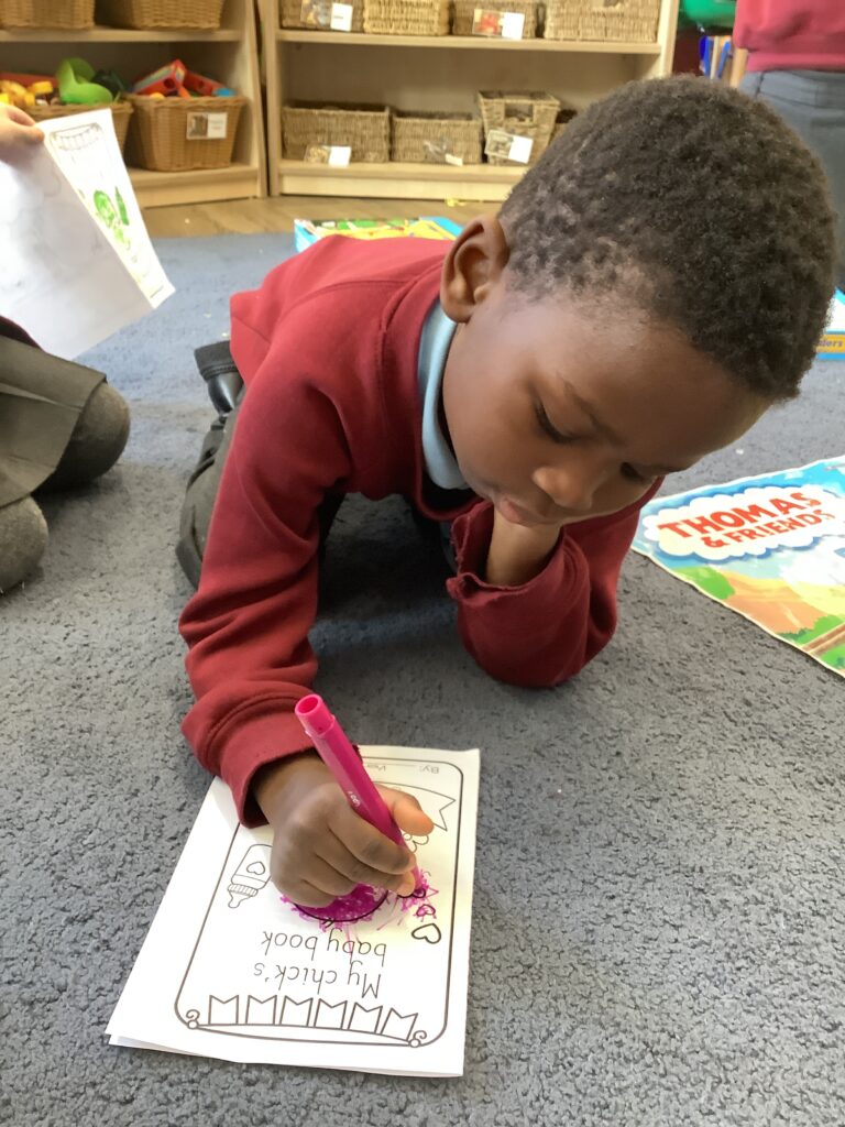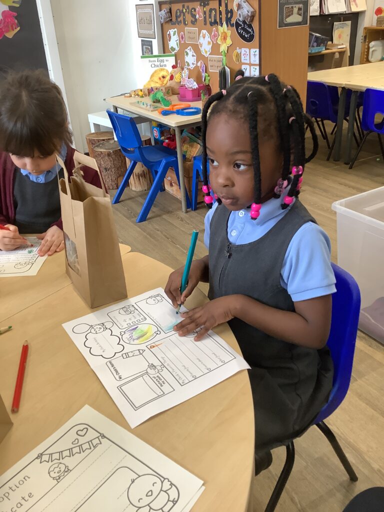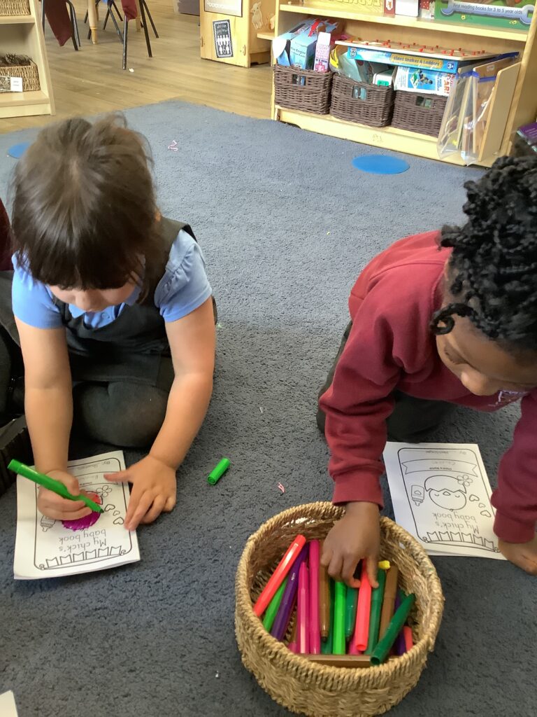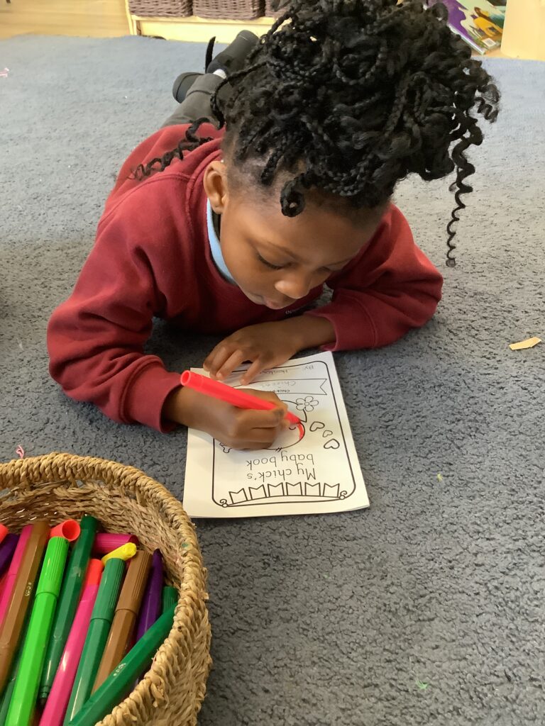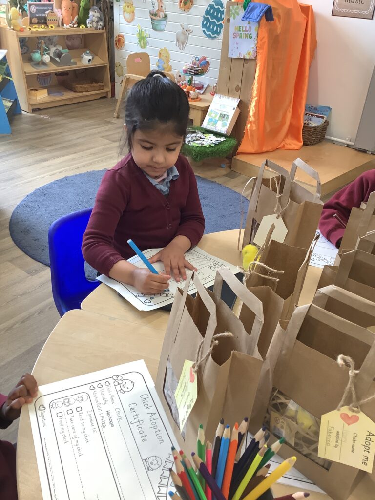 Finally, the children used their fine motor skills and knowledge and understanding of the world to make a naming certificate and baby book for their chick. This involved the children talking about how they are going to look after their chicks, what foods the chicks may like to eat and what activities they may do with the chicks.