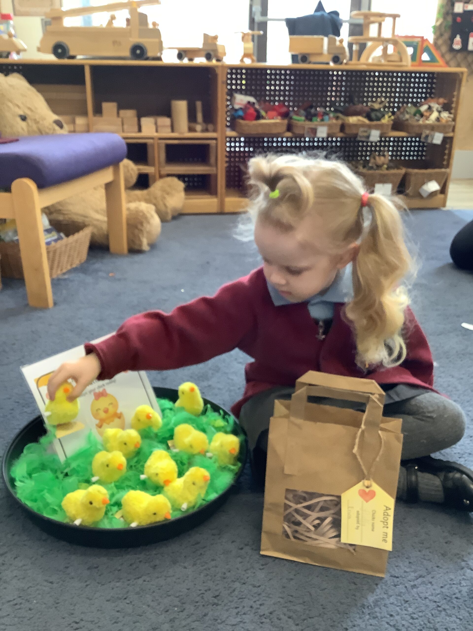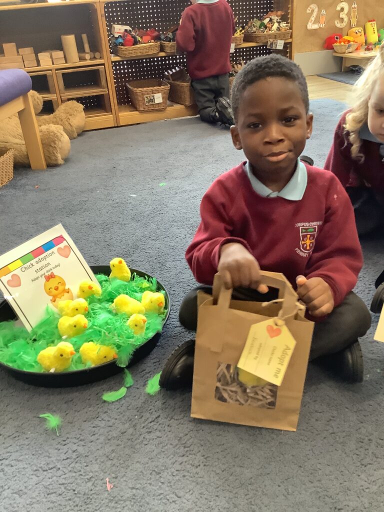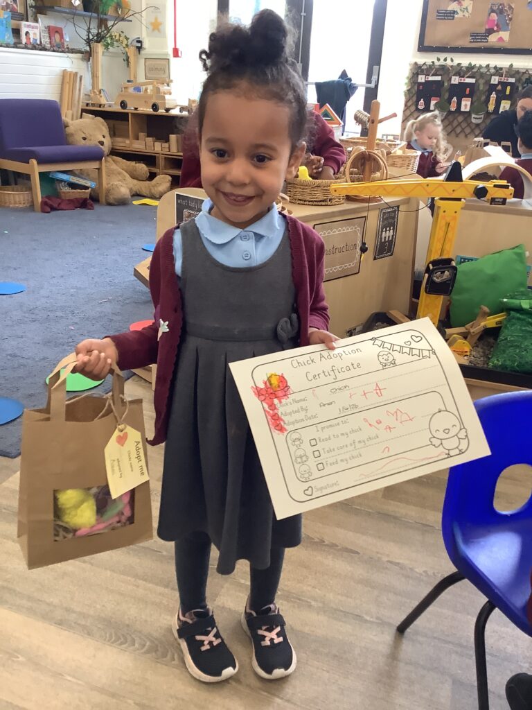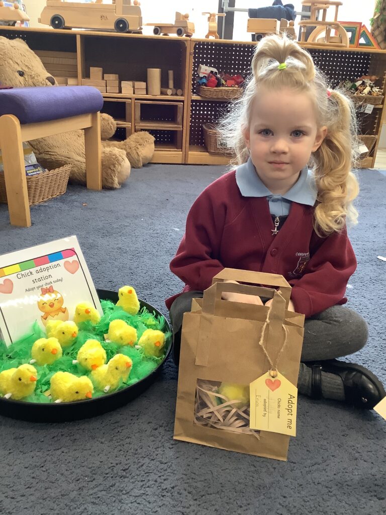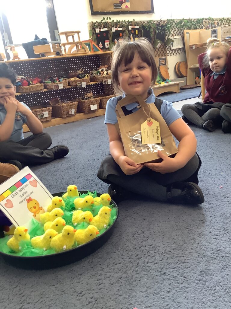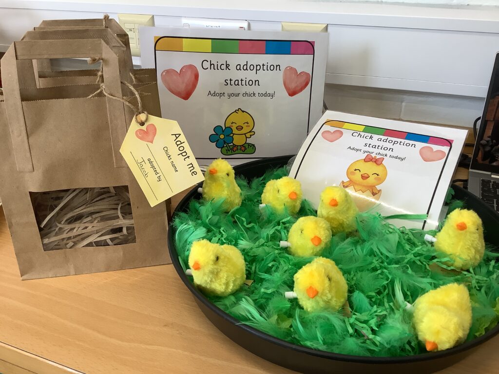 Finally this week we set up a chick adoption station; this involved the children selecting their very own (wind up) chick to take home and look after putting all that we have learned into practice.