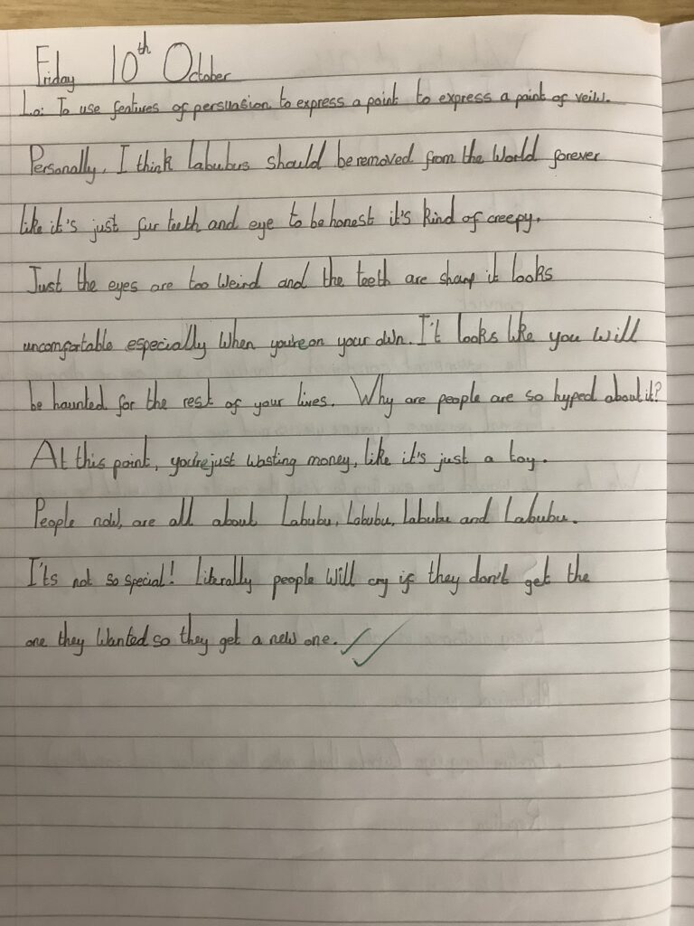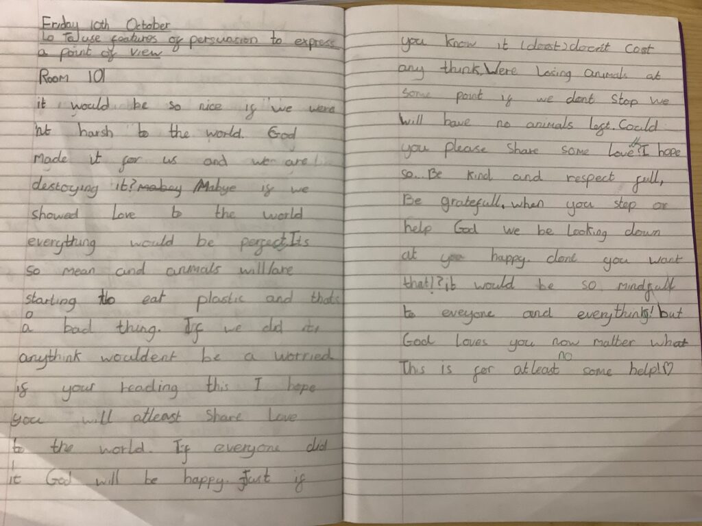 Our final piece of work connected to the text focused on persuasion. We will have a debate when we finish the text about whether we agree that the camp will turn bad boys into good boys and try to give examples from the text to back this up. To begin thinking about persuasive writing we looked at the features and had a go at including these in a piece of work about Room 101. It was really interesting to see what children would put in there! One of my favourites was the following piece: