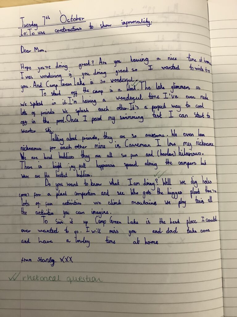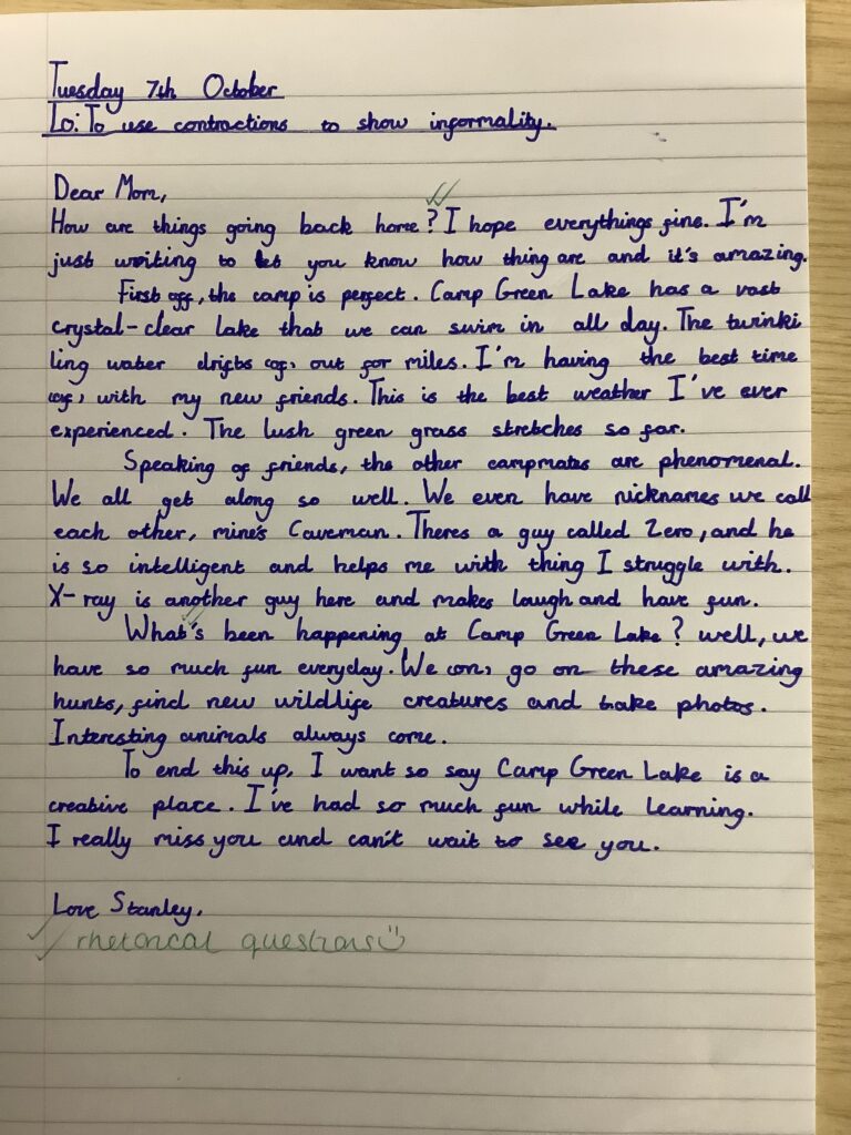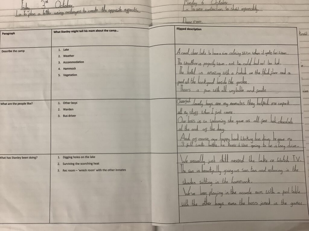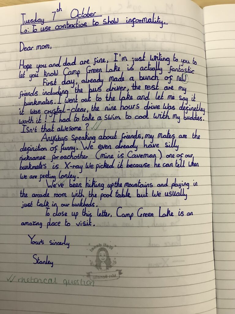 To build on this we began writing as Stanley to his mum in a letter. This was also informal but not as informal as the diary entry. We also had to work hard to flip the description of the camp to make it sound like a positive experience.
