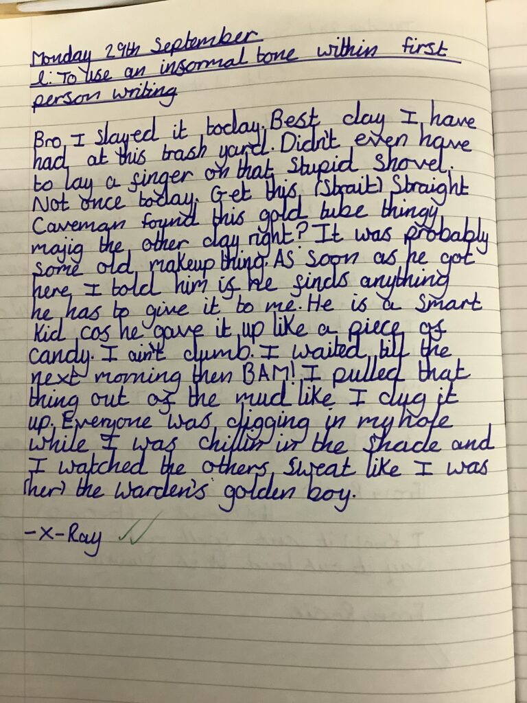 Following on from this we started to think about writing in role and from a first person perspective. We looked at levels of formality and wrote a very informal diary entry as one of the characters in the book. The children thoroughly enjoyed writing as X-ray and it was a lot of fun to read their work.